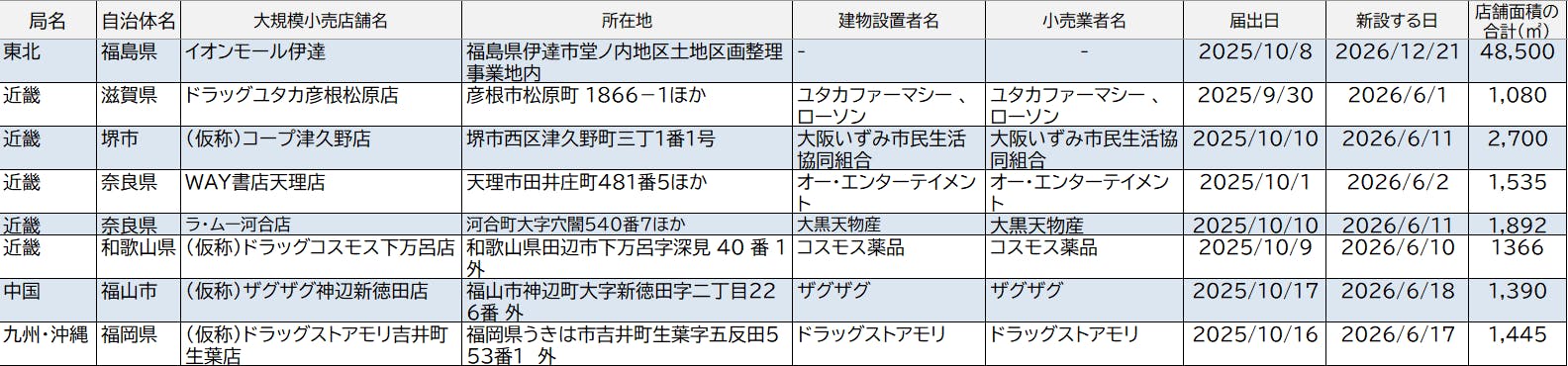 DCSオンライン編集部の調べによると、この1週間(10月22日~10月28日)で新規に確認できた大規模小売店舗立地法(大店立地法)に基づく届出情報は7件だった。経済産業省は2024年3月末に大店立地法の届出状況の公表を終了。以降は各自治体が届出状況を公表している。今週はどのような新情報があったのか。DCSオンライン編集部が独自に収集したデータを確認していこう。