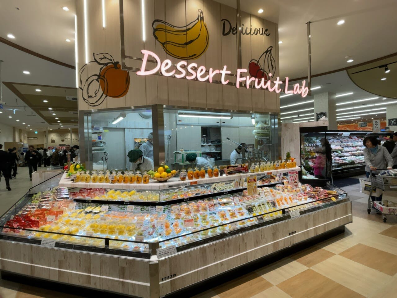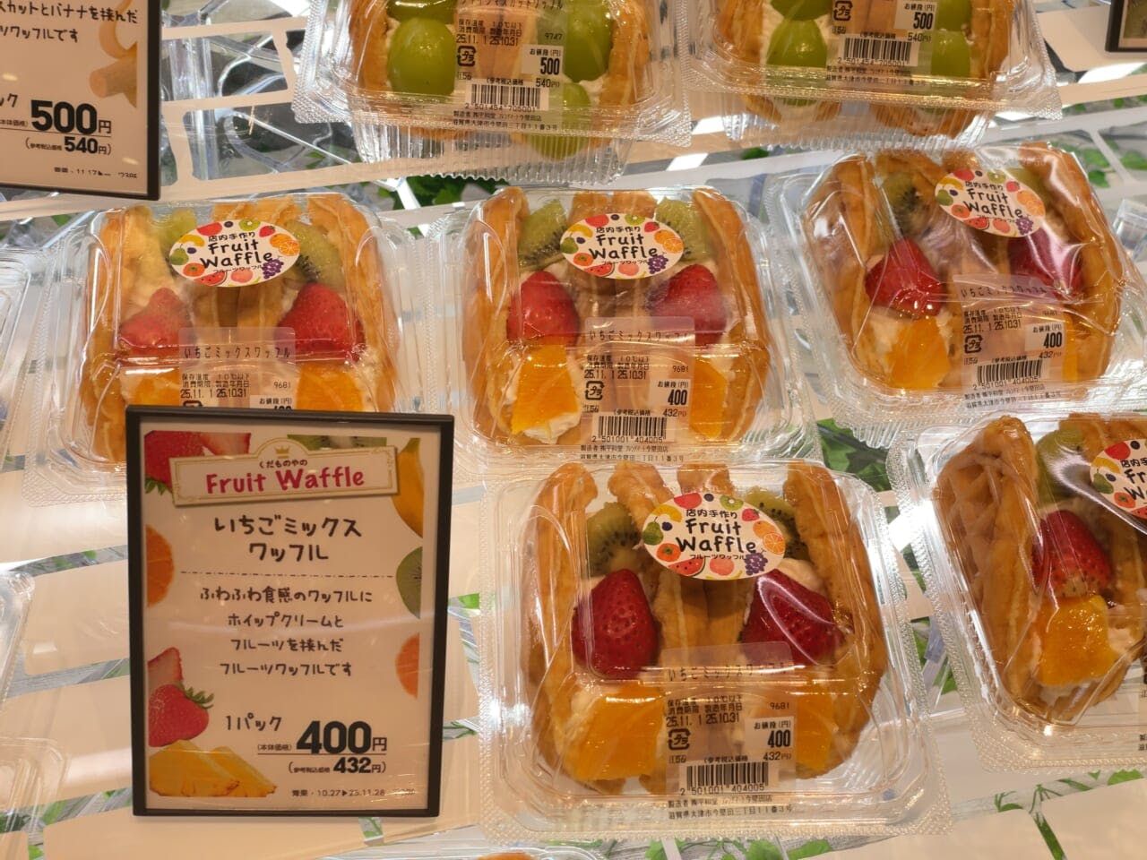 青果部門では、新鮮な果物を使ったカットフルーツのほか、サンドイッチ、ワッフルといったスイーツを集めたコーナーを特設。また単身やシニア層の個食ニーズに対応、野菜や果物のバラ売りや少量商品も徹底している。