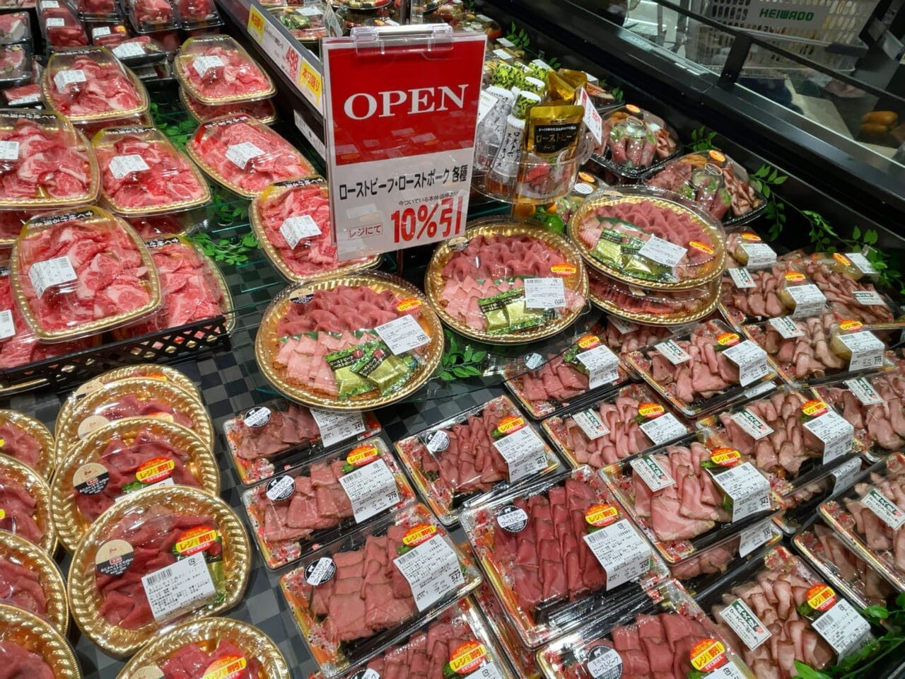 精肉部門では、主通路に面した場所に大型の冷蔵平台を据え、ローストビーフを充実させていた。