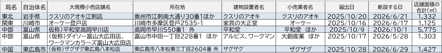 今週、新規に届出情報を確認できたのは5件だった。ドラッグストアからは2件で、クスリのアオキ(石川県)が岩手県奥州市、ザグザグ(岡山県)が広島県東広島市にそれぞれ1店舗を新規出店する。