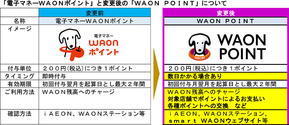 同社では、現在「電子マネーWAONポイント」と「WAON POINT」という内容の異なるポイント制度が併存している状況である。今回、利用者にとって「わかりやすく、より便利に」利用できることを目的に、イオングループ共通ポイントである「WAON POINT」へ統合する。