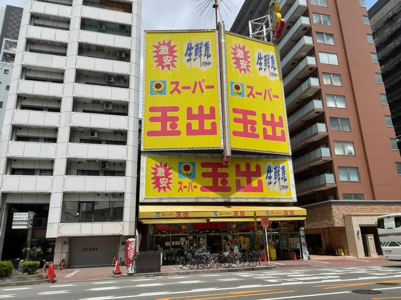 赤と黄色が目を引くスーパー玉出恵美須店の外観。まさに「安売王」の風格