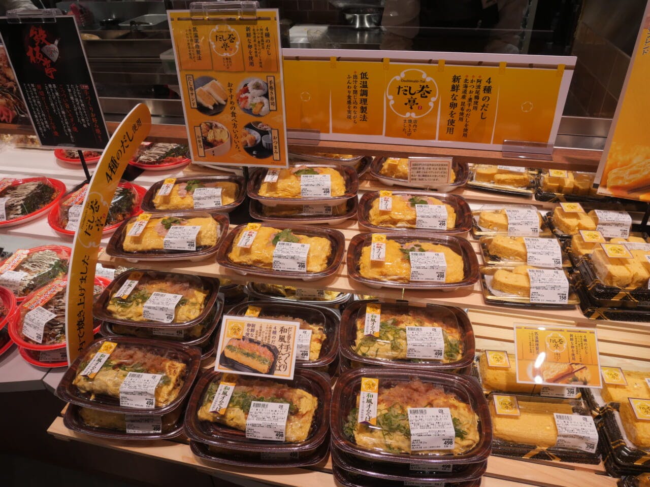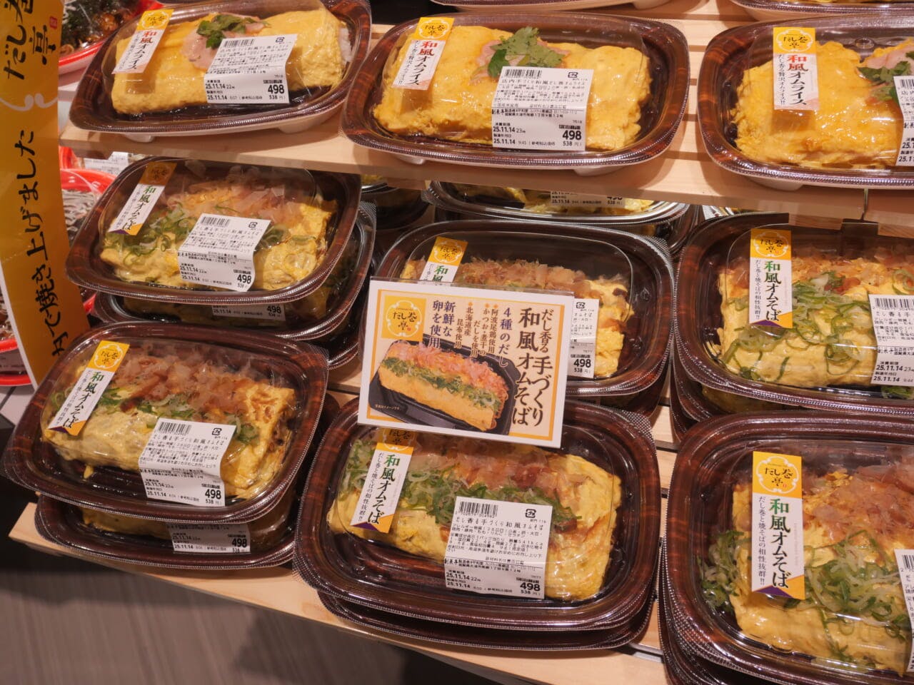 従来型の単品に加え、だし巻きから派生させた「和風オムそば」「和風オムライス」といった新しい商品も集め、「だし巻亭」というコーナーを特設。オムそばやオムライスの価格は税別498円と手頃な価格で、米価上昇を背景とした米飯商品の値上げの受け皿となる商品として売上が大きく伸長しており、売場活性化に大きく寄与しているという。