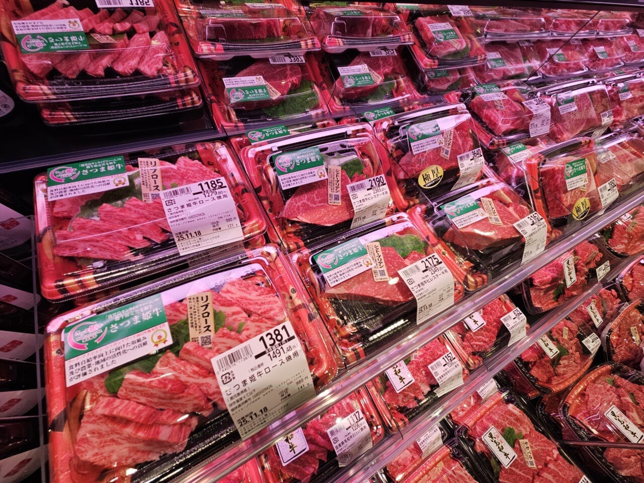 市川コルトンプラザはミートパークの位置づけではないものの、一部施策を導入。インストア加工比率50~60%をめざして店内加工に注力するほか、幅広いラインアップを展開する。たとえば牛肉だけでも「黒毛和牛」「松坂牛」、イオンのプライベートブランド(PB)「トップバリュ」の「北海道産匠和牛」、「トップバリュ グリーンアイ」の「タスマニアビーフ」、ダイエーのオリジナルブランド黒毛和牛「さつま姫牛」など複数ブランドを揃える。「トモサンカク」などの希少な部位のほか、少量パックも扱い、多様なニーズに対応する。