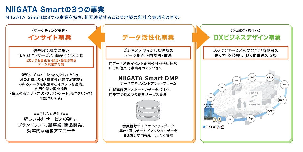 星野 事業の核となるのは「NIIGATA Smart」というデータマネジメントプラットフォームです。地域の事業者が持つ会員情報や利用履歴などを連携させ、サービス間の接続によって利用者に便利でお得な体験を提供します。その結果として得られる多様なデータを一元的に管理・分析することで、顧客理解を深め、地域企業のマーケティングや商品開発に活用できるよう支援します。
