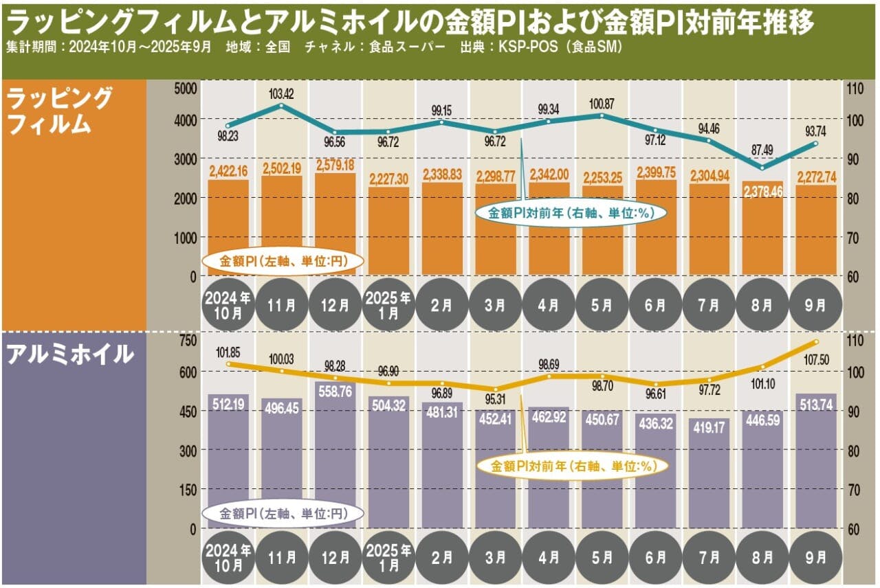アルミホイルの期間通算の金額PIは、478円で対前年同期比0.8%減、数量PIは2.78で同4.5%減となった。アルミホイル市場を牽引するのは、表面にシリコーン加工を施したアルミホイルで、油なしでもフライパンに食品がくっつかず、焦げ付きにくい特性から、フライパンやオーブントースター、ホットプレートなどでの利用が広がっている。