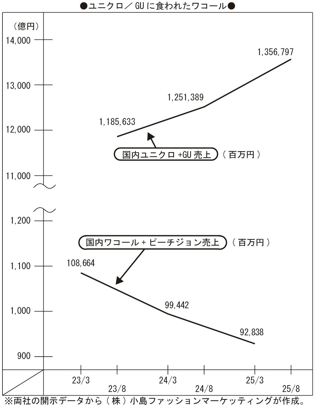 それを推察させるのが、国内ユニクロとジーユーの合計売上と国内ワコールとピーチ・ジョンの合計売上の2023年から2025年にかけての明暗だ。前者がこの間に14.4%伸びたのに対し、後者は14.6%減少している(図表参照)。増減はほぼ同率だが、前者の増加額が1711億6400万円だったのに対し、後者の減少額は158億2600万円と1ケタ小さく、すでに掃討戦の様相を呈している。