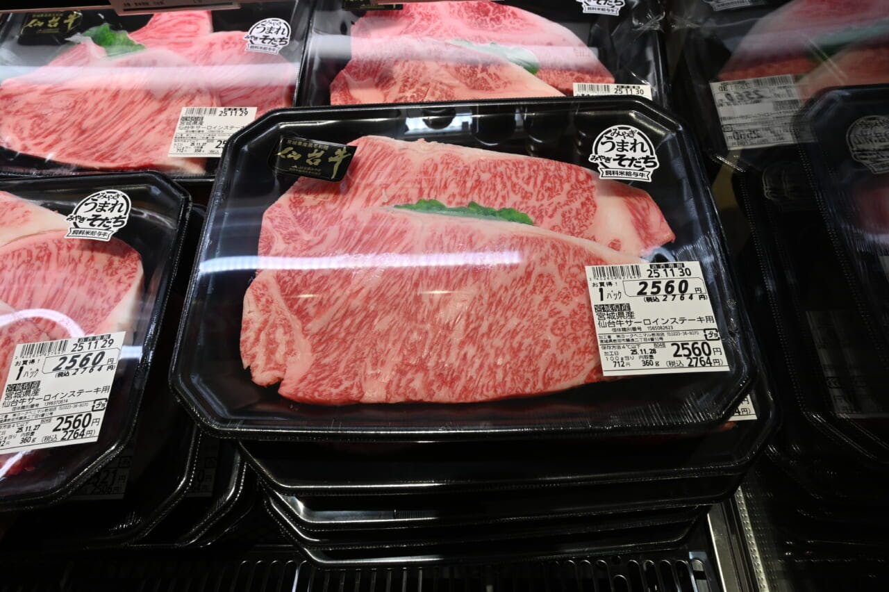 精肉では、国産黒毛和牛を目玉商品として強く打ち出す。オープン日に配布したチラシでは「黒毛和牛サーロインステーキ用」(1枚1280円)を表面中央に掲載。開店当日は、チラシを手に持った多くのお客が商品を買物カゴに入れていた。