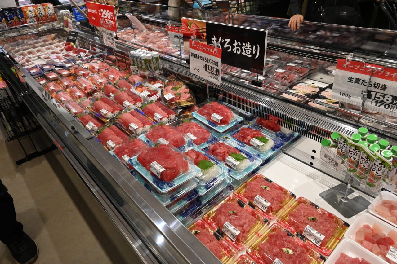 鮮魚では、マグロの品揃えを強化している。柵、刺身をさまざまなサイズで陳列し、開店記念の「オープニングプライス」として、特別価格で提供していた。