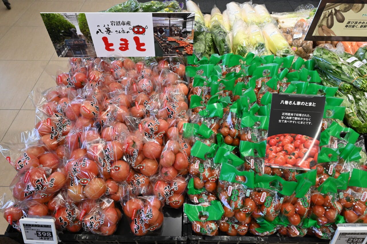入口左側の平台では、岩沼市近郊の地元野菜を集積し、コーナー化している。取材時は岩沼市内で生産している「八巻さん家のとまと」(1袋398円)などを販売していた。