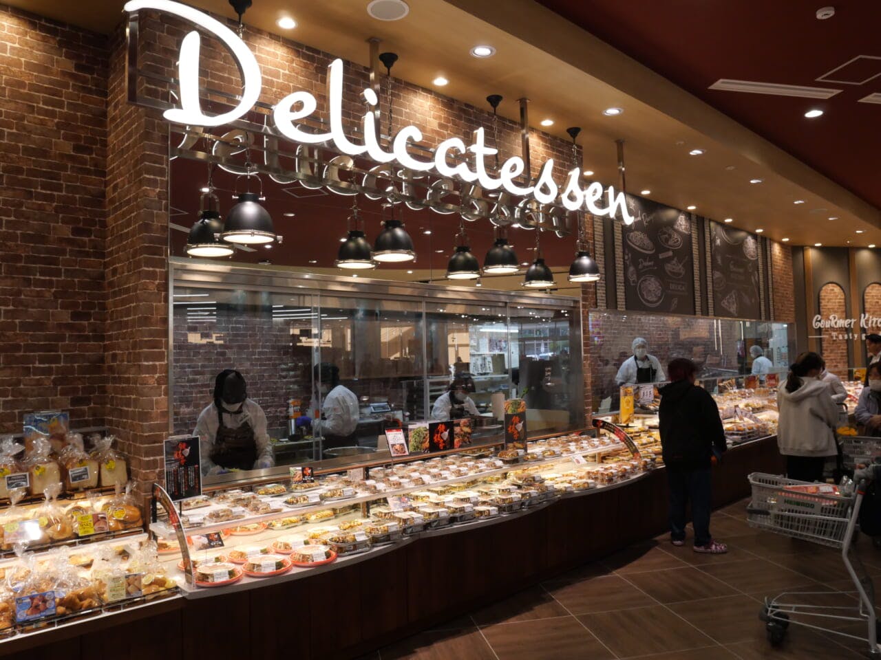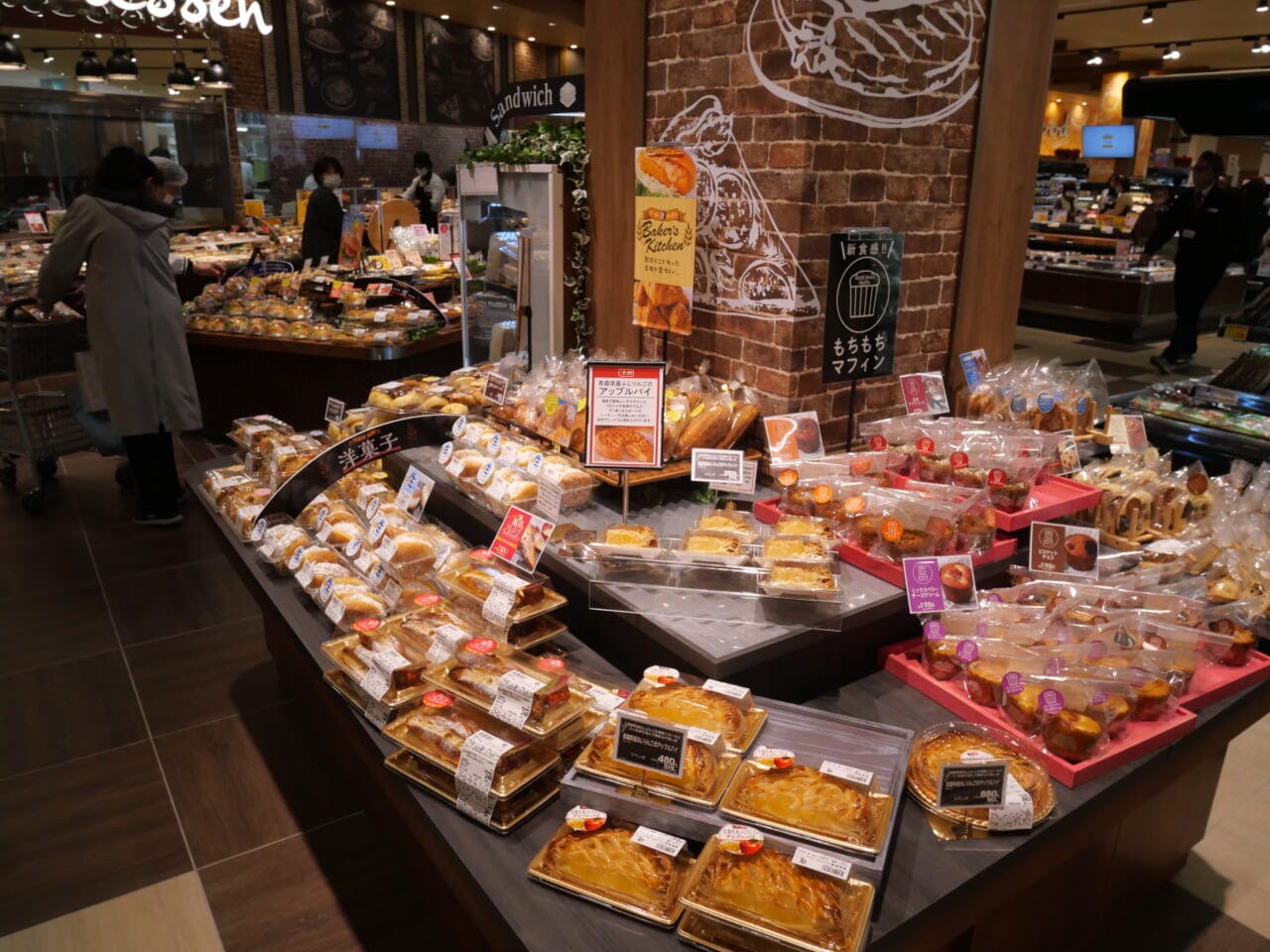 中でもデリカは強化部門。壁面の一角に鉄板コーナーを特設し、「お好み焼き」「焼きそば」などできたて・つくりたて商品の提供に力を入れる。デリカの一角にあるベーカリーでは、「スイーツ」をテーマにしたアイテムを集めて来店客に訴求していた。