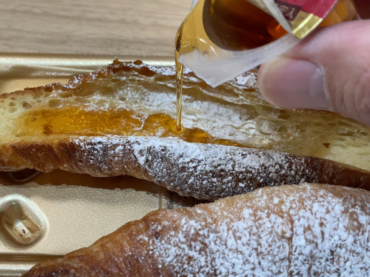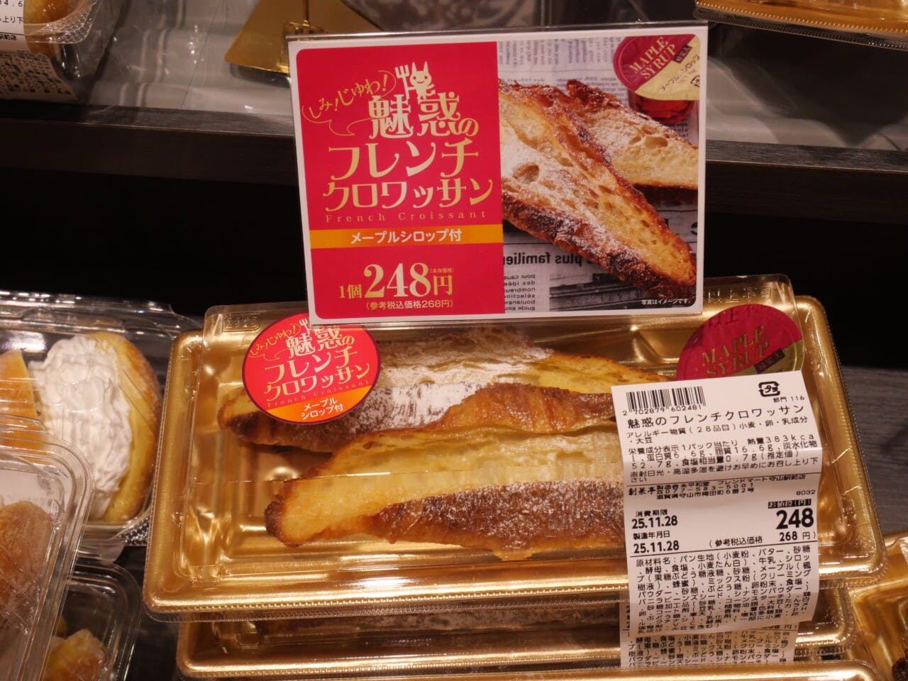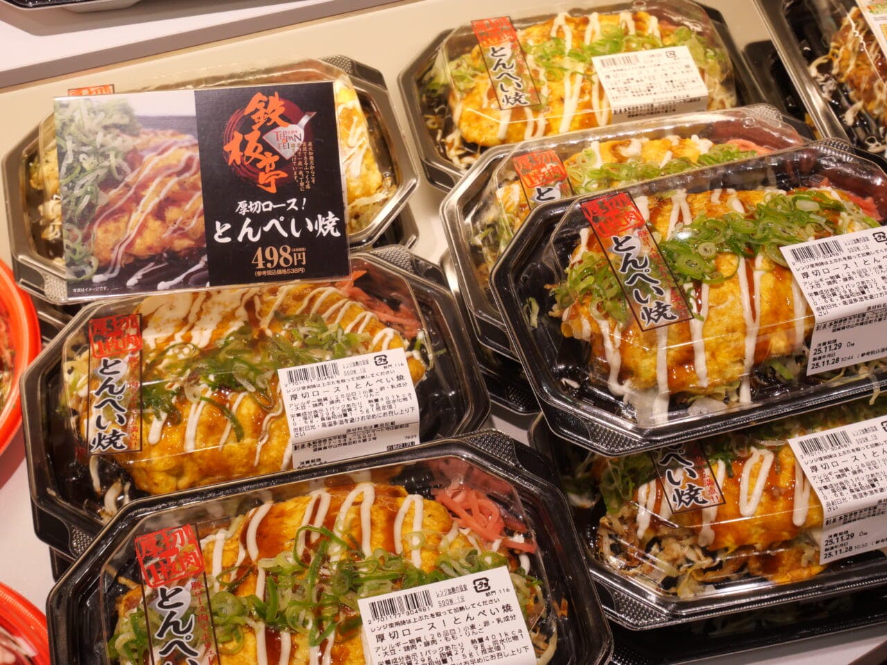 今回、デリカ部門で並んでいた商品のうち、鉄板で調理された「厚切りロース!とんぺい焼」(本体498円)と、ベーカリーの「スイーツ」コーナーにあった「魅惑のフレンチクロワッサン」(同248円)を購入し、イートインスペース「フレンドコート」で試食した。