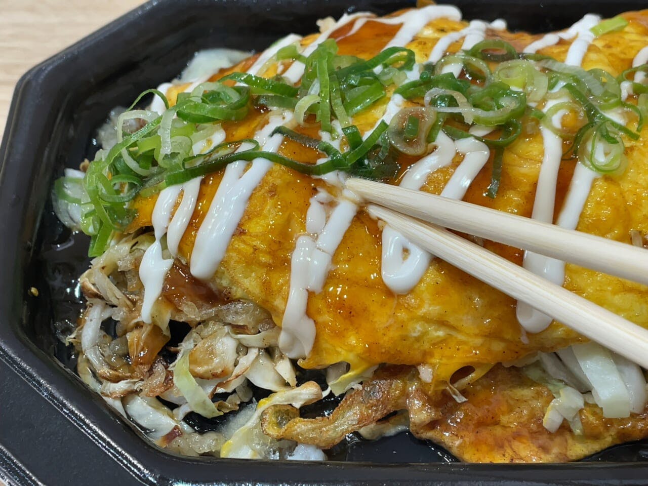 とんぺい焼は、厚切りのロース肉がしっかりと入ったボリューム感に、キャベツの食感が加わり満足感が高い。ソース味ながら濃すぎず、最後まで飽きさせない味付けは、調理マニュアルが忠実に実行されていることを感じさせる。